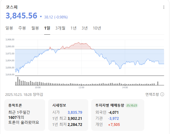 10월 23일 코스피는 역사적인 장중 3900 돌파라는 성과를 남겼지만,